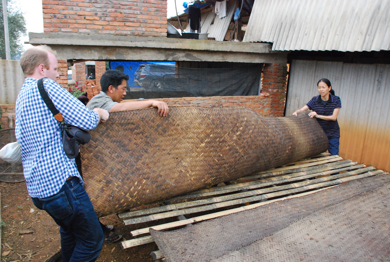 On the other side of Ge Er’s house, large mats covered in maocha were drying under overcast skies. It usually takes 5 hours to dry, but it suddenly began to drizzle. “Quick!” Ge Er yelled, “Everyone help to bring the maocha inside!” We hustled into action, almost falling down the steep stairs of his hut, then struggled to roll up & lift the heavy mats with their valuable cargo. It tooks us a few minutes to get all the tea inside the shed, where most of the available space was already covered in wilting leaves!