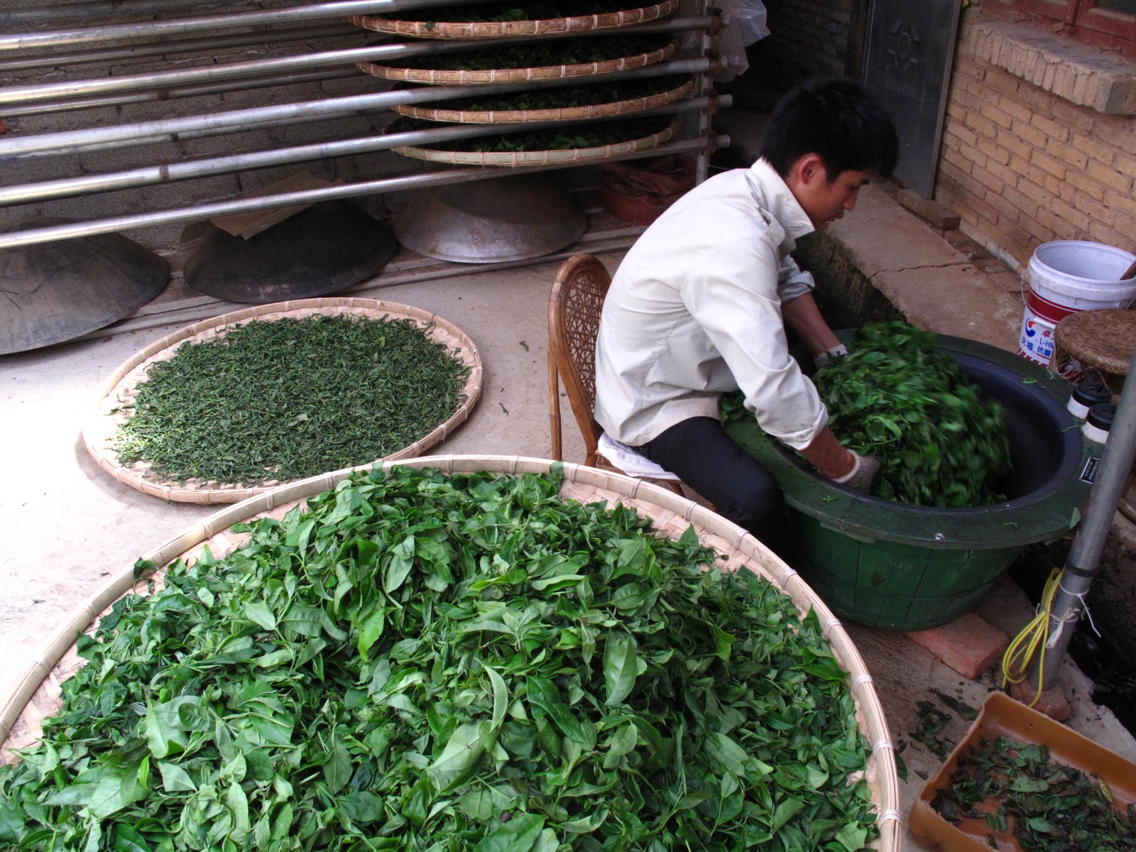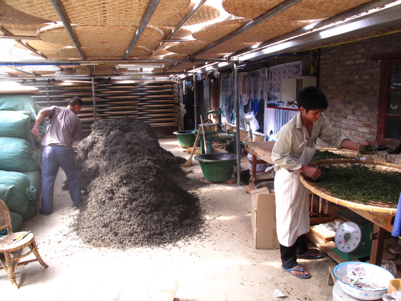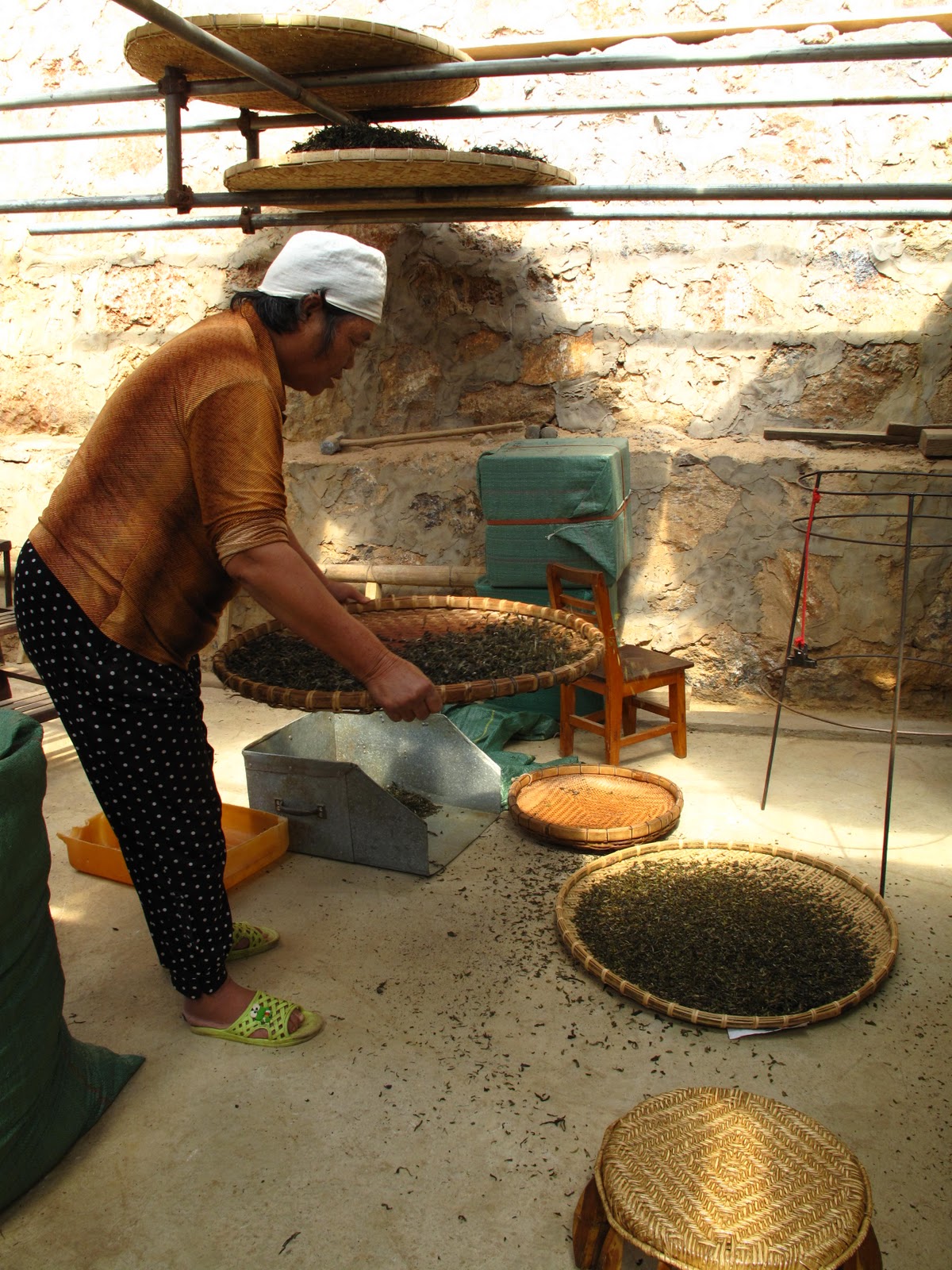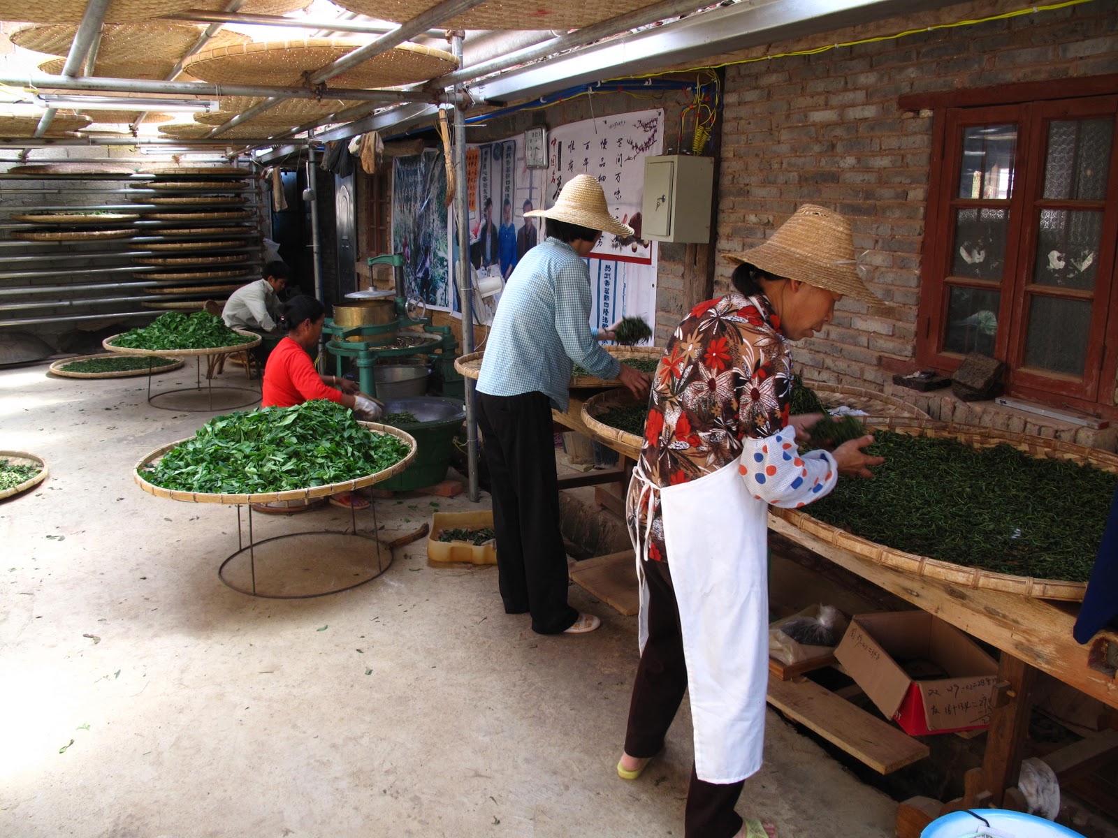 After wok-frying, the leaves are scattered over pans for sun drying. You can see the drying racks above the heads of the workers. Sunlight passes through the transparent PVC sheeting, cheaper than glass, but in my opinion, not as good as direct sunlight.